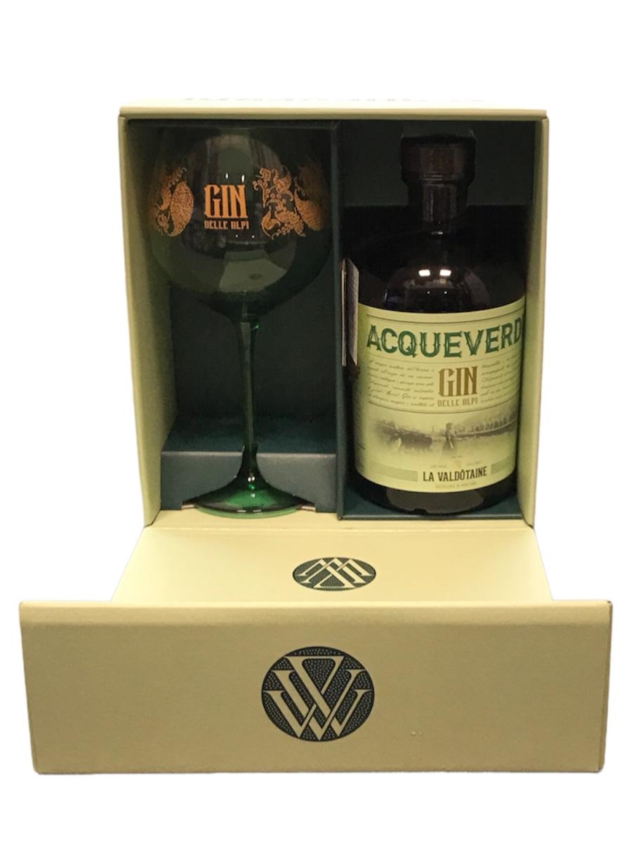 Cofanetto con una bottiglia cl.100 e un calice. A Saint-Marcel, un enorme, secolare castagno nei pressi del Santuario di Plout, indica l’inizio del magico sentiero del Verruc che porta alle ACQUEVERDI, “eiva verta” nel patois di Saint-Marcel. Qui si respira un’atmosfera fatata e ovattata di tranquillità e di silenzio accompagnato dal gorgoglio delle Acqueverdi, di uno straordinario e luminoso colore verdeazzurro, ruscello sulle cui rive crescono le essenze che rendono unico questo Gin Alpino.