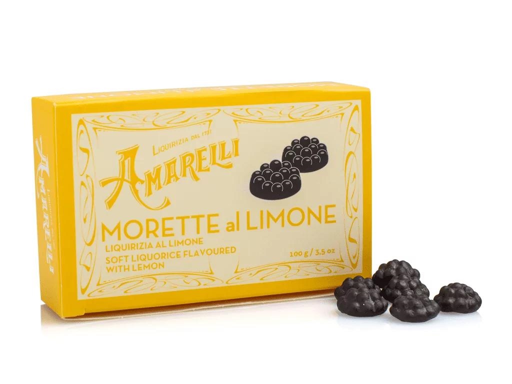 Gommose e dal gusto delizioso: le Morette al Limone Amarelli in un'elegante e colorata scatolina di carta. Gusto: Liquirizia al limone Confezione: Scatola Peso: 100g Specialità: Morette Classico ed elegante astuccio in cartone da 100g.