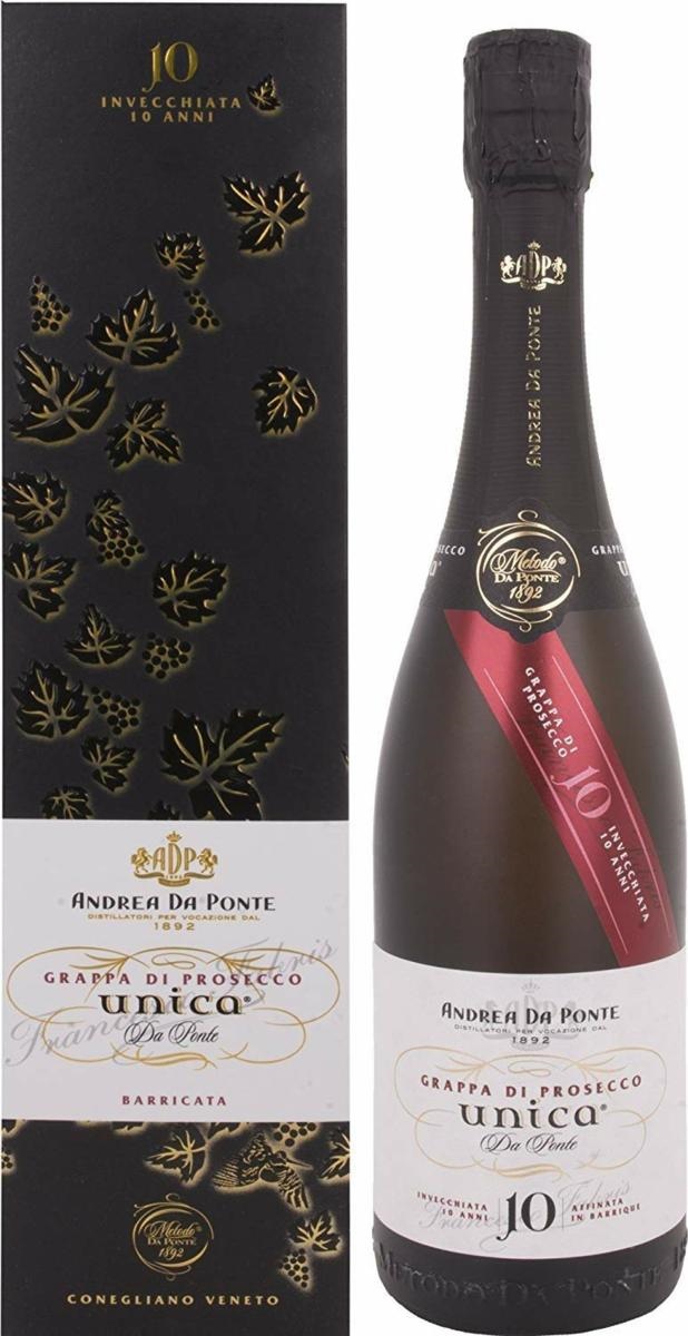 Formato bottiglia: cl.70 Gradazione alcolica: 40% vol. Prodotto in Italia. Con astuccio. La grappa di Prosecco Unica, millesimata 10 anni, nasce dalle uve del Prosecco Superiore DOCG. Dal colore giallo dorato con sfumature ambrate, regala un bouquet cangiante dai richiami a vini liquorosi e sentori floreali che si arricchiscono con accordi di legno stagionato e mandorle ben tostate. Al gusto è vellutata e asciutta, avvolgente, con percezione di miele e note vanigliate. Distillata secondo i dettami dell’esclusivo Metodo Da Ponte, Unica ha un’anima raffinata e coinvolgente, distillato sincero di conoscenza e passione.