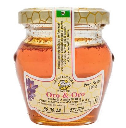 Questo miele, di colore arancio intenso, rappresenta uno dei prodotti più importanti dell’azienda Apicoltura Bianco. La dolcezza del miele di Acacia e l’aroma intenso e persistente dello Zafferano avvolgono e deliziano il palato. Questo alimento, dagli alti valori nutritivi e qualitativi, conserva il sapore tradizionale del miele esaltato dall’eleganza dello Zafferano. Un prodotto di assoluta purezza senza conservanti né dolcificanti. Ingredienti: miele di Acacia 99,85 g, pistilli e Zafferano d’Abruzzo 0,15 g Utilizzo: ottimo se degustato in purezza su un cucchiaino. Perfetto per accompagnare formaggi pecorini e vaccini. In cucina su carni lesse e per dessert. Indicato anche per dolcificare infusi e tisane Zona di produzione: Abruzzo Conservazione: in un luogo fresco e asciutto
