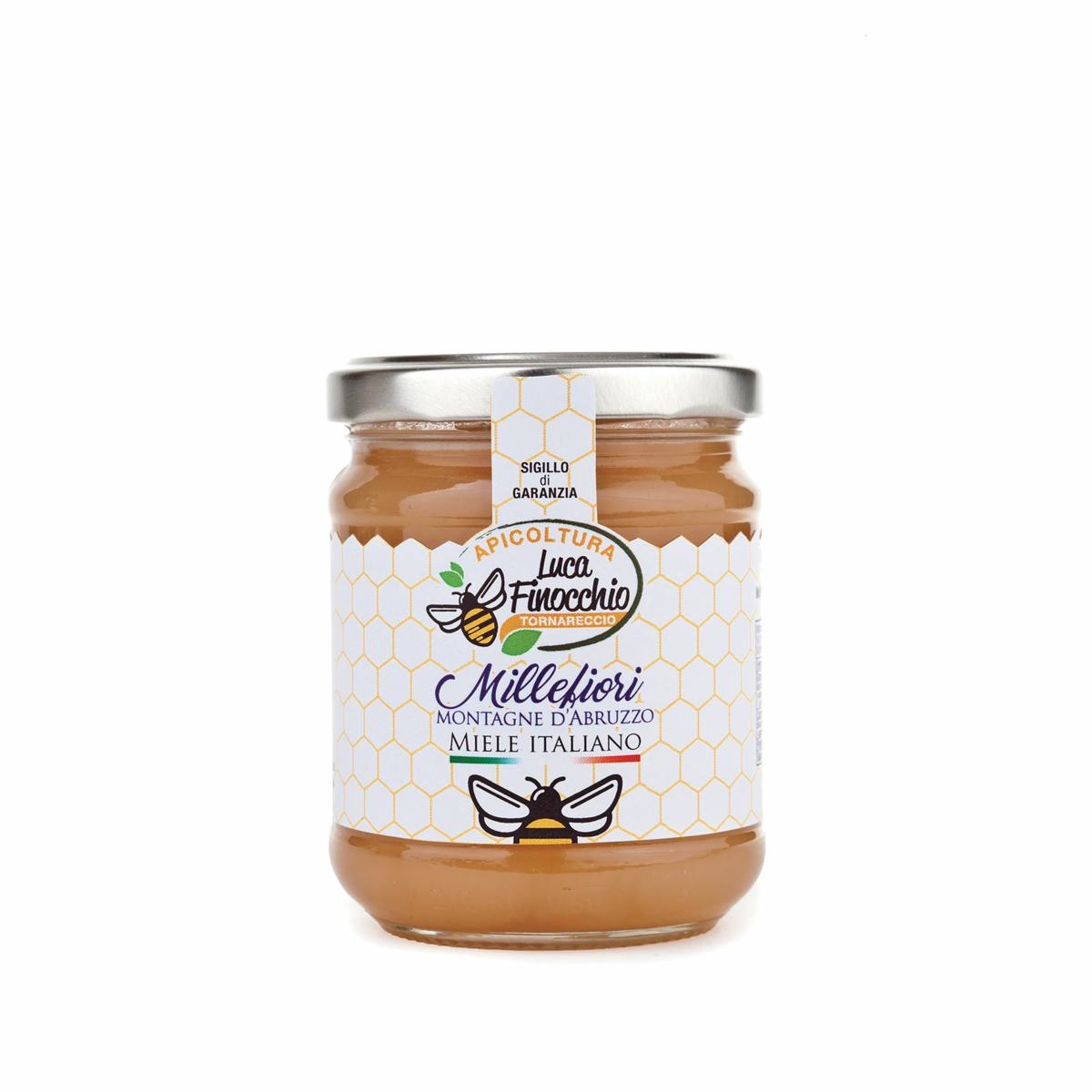 Gr.500 Millefiori delle montagne d’Abruzzo Colore: da ambrato molto chiaro fino ad assumere tonalità scure Cristallizzazione: a seconda della specie floreale dominante Aroma: intenso Sapore: caratteristico dei fiori principali Usi: classico dolcificante, ottimo per dolcificare lo yogurt Periodo di produzione: da maggio ad agosto Zona di produzione: Abruzzo
