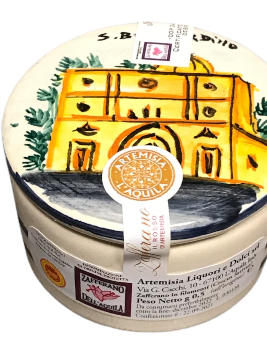 Formato: gr.0,5 Le pregiate ceramiche di Castelli lavorate e decorate a mano contengono lo Zafferano dell’Aquila D.O.P. in filamenti da 0,5 g. Lo Zafferano dell’Aquila D.O.P. in filamenti si ottiene dalla tostatura a legna degli stimmi del fiore del Crocus Sativus.