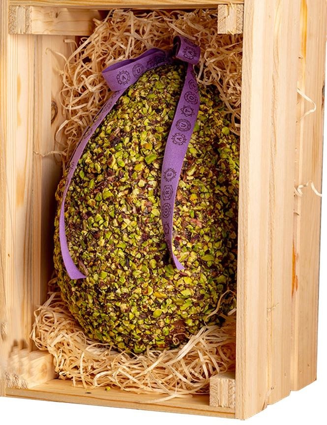 Uovo di cioccolato al latte con pistacchio in cassetta legno Una speciale confezione in legno contenente un uovo artigianale realizzato con finissimo cioccolato e ricoperto da granella di pistacchio verde di Bronte D.O.P. Un'idea gustosa e di stile! Disponibile con cioccolato fondente o al latte. Ingredienti variante al latte:Cioccolato al latte (pasta di cacao, zucchero, burro di cacao, emulsionante lecitina (di soia), aroma naturale di vaniglia), Pistacchi tostati (29%). Cacao min nel cioccolato: 35% Puó contenere tracce di altra frutta a guscio, latte e uova, arachide. Conservare in un luogo fresco e asciutto lontano da fonti di calore.