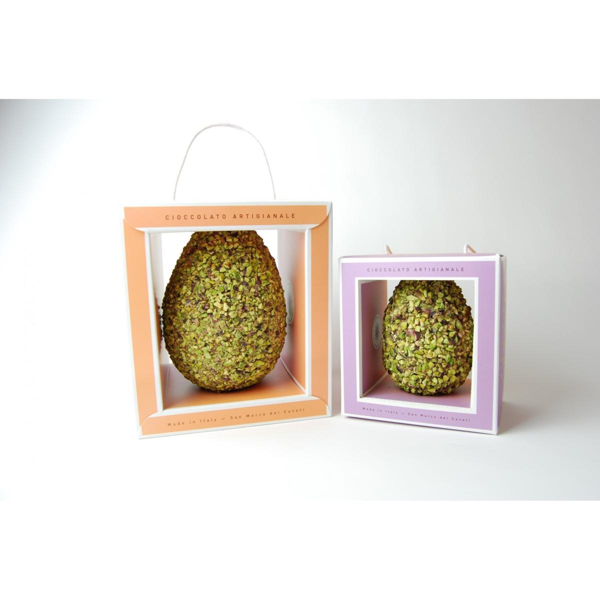 Un'elegante confezione regalo contenente un uovo di cioccolato al latte ricoperto con granella di pistacchio verde di Bronte D.O.P. Un dono speciale per le ricorrenze pasquali.