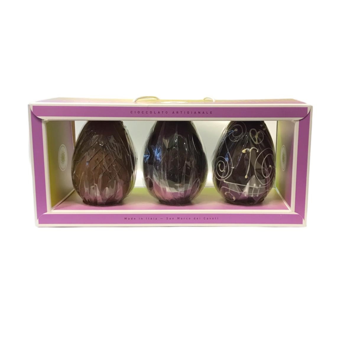UOVO DECORATO AL LATTE: ingredietni zucchero, buro di cacao, cacao (min 35%), latte intero in polvere, fave di cacao, emulsionante: lecitina di soia, vaniglia UOVO DECORATO FONDENTE: fave di cacao, zucchero, burro di cacao, cacao (min 62%), emulsionante: lecitina di soia, vaniglia UOVO MONORIGINE: fave di cacao del Venezuela, zucchero rosso, buro di cacao, cacao (min. 72%), emulsionante: lecitina di soia, vaniglia Può contenere tracce di frutta a guscio, latte, arachidi. Peso: 450gr SENZA GLUTINE