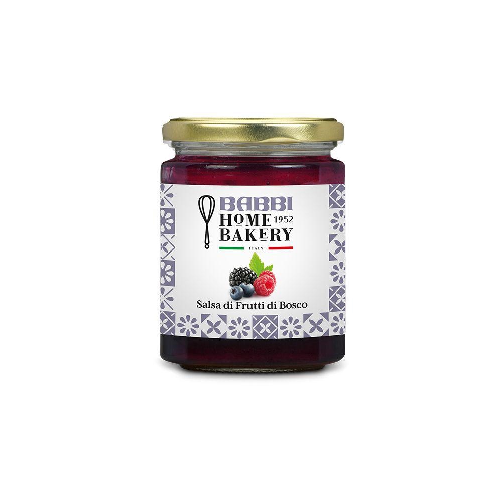 Gr.300 Crea dessert golosi e dal gusto originale ed agrodolce con la Salsa di Frutti di Bosco Babbi Home Bakery, un prodotto VEGAN e SENZA GLUTINE ideale per variegare gelati, yogurt, creme pasticcere e per guarnire dessert come muffin, waffles, pancakes e crepes!