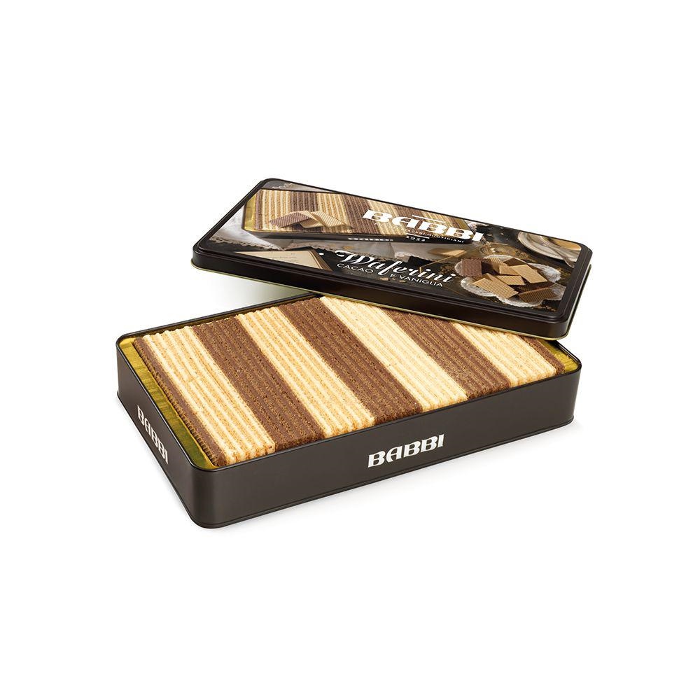 Gr.250 I Waferini assortiti Vaniglia e Cacao sono racchiusi nella latta Piccoli Piaceri (circa 105 pezzi) che mantiene intatti aroma e freschezza del prodotto, e la rende perfetta per un regalo elegante e goloso. Conservare in luogo fresco e asciutto, ad una temperatura massima di 20°C. Richiudere accuratamente la latta per mantenere la fragranza della cialda.