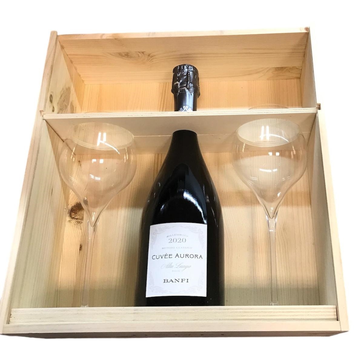 Banfi cassetta cuvèe Aurora con due calici. Formato bottiglia: 75 cl. Gradazione alcolica: 12% vol. Colore giallo paglierino, perlage fine e molto persistente. profumo intenso e fragrandte, caratterizzato da sentori di scorza di agrumi canditi, lievito e vaniglia. In bocca esprime tutta la sua eleganza e armoniosità che si chiude in un finale di bocca freso e sapido. Vino ideale per l'aperitivo; perfetto con le ostriche, i frutti di mare crudi e cotti e i crostacei.