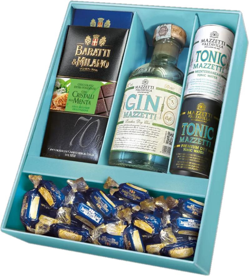 Un incontro esclusivo ed estremamente attuale tra una selezione di cioccolato Baratti & Milano e il Gin prodotto da Mazzetti d'Altavilla: note agrumate e botaniche che esaltano il cioccolato, presentato con la tavoletta Extra Fondente 70% con cristalli di menta, la tavoletta al latte con cristalli di caramello e morbide praline con ripieno al latte, in una confezione vivace e sorprendente. Un’esperienza multisensoriale per chi ama esplorare nuovi accostamenti.