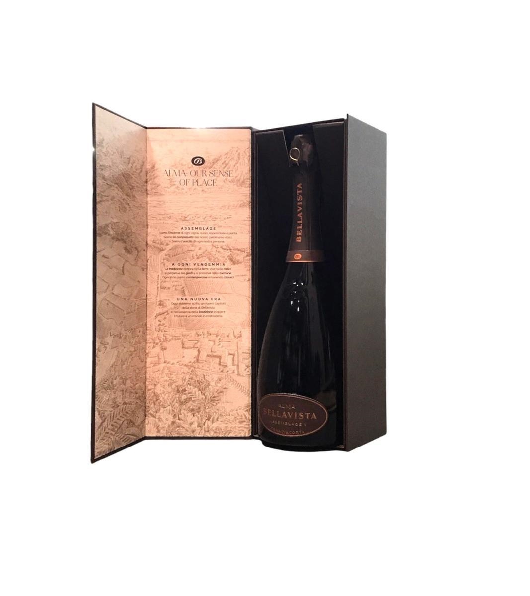Formato bottiglia: cl.75 Gradazione alcolica: 12,5% vol. Con astuccio. Il Franciacorta Brut Grande Cuvée Alma Bellavista nasce dall’unione di oltre trenta selezioni, provenienti da un centinaio di terreni sparsi per tutta la zona. Ottenuto da un 77% di Chardonnay, 22% di Pinot Nero e 1% di Pinot Bianco, esprime nel bicchiere le straordinarie potenzialità delle bollicine italiane e conferma ancora una volta la crescita costante delle bottiglie prodotte in questo angolo felice di Lombardia. L’affinamento di 36 mesi sui lieviti gli conferisce sentori delicati, regalando l’impressione di una bollicina perfetta per ogni occasione di festa e, al tempo stesso, capace di adattarsi meravigliosamente a tutto pasto. Alma Bellavista conquista da subito per l’abito giallo paglierino, per il raffinato perlage e per la suadente e ricca spuma bianca. Il profumo fragrante e intenso, tipico dei Metodo Classico, è invitante e persistente, delicato e avvolgente. Un nucleo compatto di agrumi, fieno e miele che abbraccia sentori di crosta di pane e ricordi di lievito. In bocca il perlage incessante e i pregiati sentori olfattivi si fondono in un’unica sensazione, intensa e bellissima, guidata da una freschezza inebriante. Il nostro invito è quello di cercare di esprimere con le proprie parole l’emozione trasmessa da questo Brut made in Franciacorta. Ve ne suggeriamo soltanto una: Bellavista. E forse racchiude in sé tutto il pregio di questa bottiglia