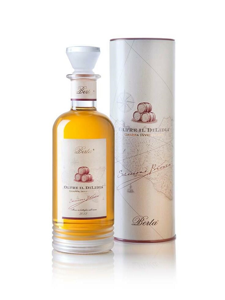 Capacità bottiglia: cl. 70 Gradazione: 43% vol. Vitigni: Barbera, Moscato La grappa Oltre Il DiLidia è una grappa invecchiata che nasce dall’attento assemblaggio di grappe del territorio, distillate con il tradizionale metodo discontinuo a corrente di vapore e sapientemente invecchiate in botti da Marsala. Una tradizione che si rinnova: i primi legni utilizzati per l’invecchiamento dei distillati Berta furono proprio quelli che giungevano negli anni Cinquanta e Sessanta presso le Aziende Vinicole dì Canelli dalla Sicilia per la produzione del Marsala all’uovo. Una volta svuotate, le botti non potevano più essere utilizzate per l’affinamento di altri vini, tanto erano impregnate delle note aromatiche del Marsala, da qui l’intuizione di nostra madre Lidia, canellese Doc, di utilizzarle per l’invecchiamento delle Grappe distillate dal marito Paolo.