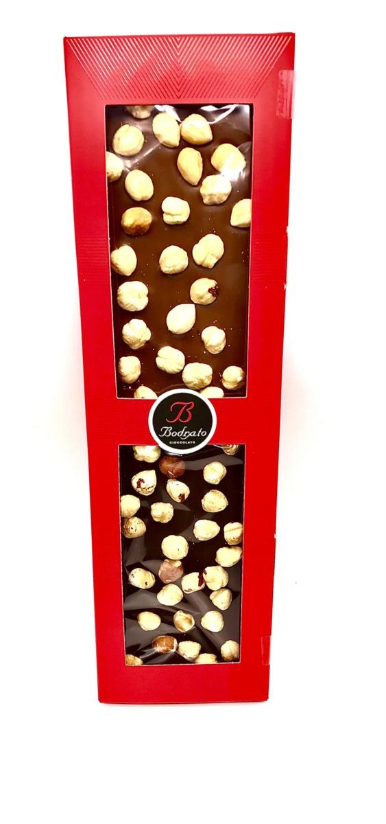 Piastrella di cioccolato metà al latte e metà fondente con nocciole.