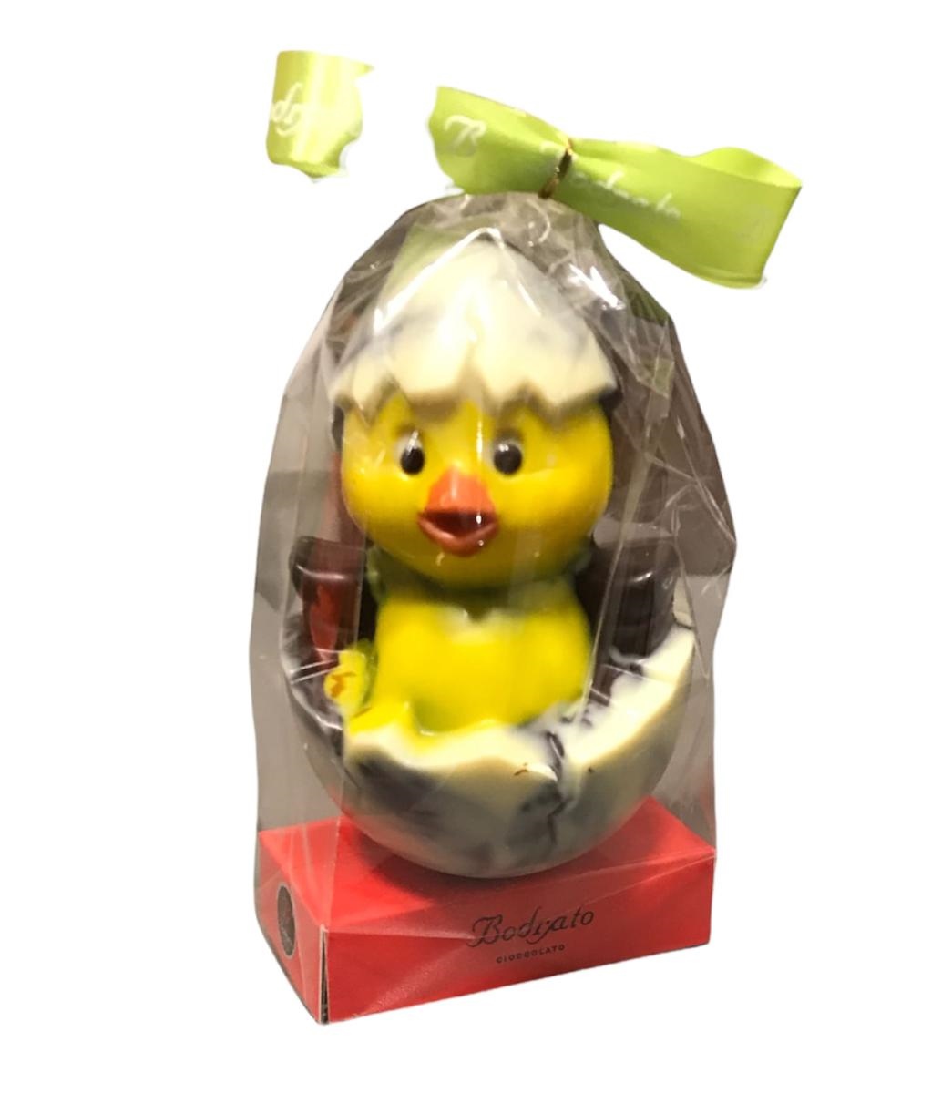 Un simpatico pulcino con uovo al latte da 100 gr firmato Bodrato con incarto trasparente!