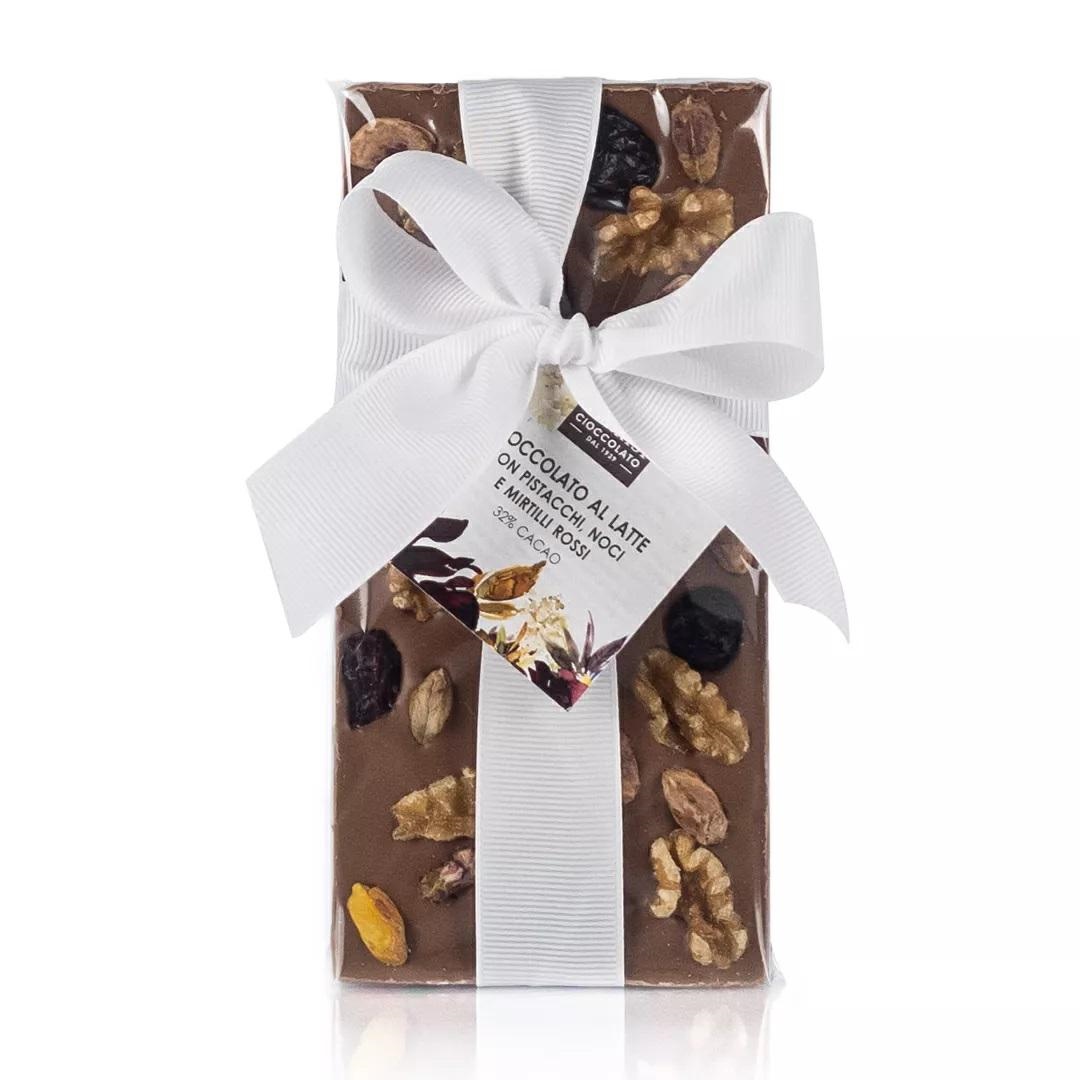 Tavoletta al latte con pistacchi, noci e mirtilli rossi: cioccolato al latte dal puro ed inconfondibile gusto di cacao esaltato dalla dolcezza delle note del latte decorato con pistacchi interi, noci e mirtilli rossi. Fatta e confezionata a mano