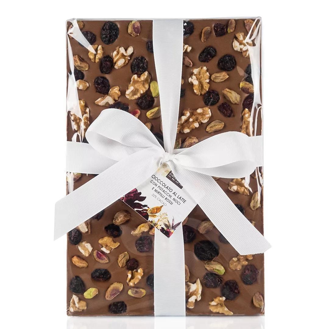 Gr.600 Senza Glutine. Tavoletta al latte con noci, pistacchi e mirtilli rossi: cioccolato al latte dal puro ed inconfondibile gusto di cacao esaltato dalla dolcezza delle note del latte decorato con pistacchi interi, noci e mirtilli rossi. Fatta e confezionata a mano.