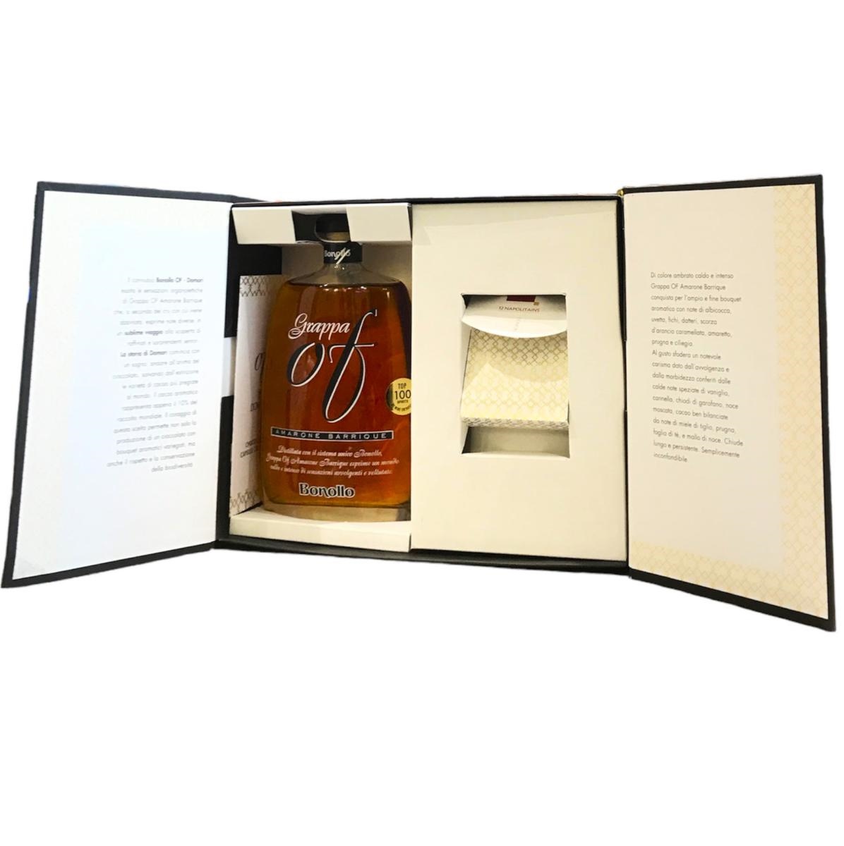 Il connubio Bonollo OF - Domori esalta le sensazioni organolettiche di Grappa OF Amarone Barrique che, a seconda del cru con cui viene abbinata, esprime note diverse. In un sublime viaggio alla scoperta di raffinati e sorprendenti sentori. La storia di Domori comincia con un sogno: andare all'anima del cioccolato, salvando dall'estinzione le varietà di cacao più pregiate al mondo. Il cacao aromatico rappresenta appena il 10% del raccolto mondiale. Il coraggio di questa scelta permette non solo la produzione di un cioccolato con bouquet aromatici variegati, ma anche il rispetto e la conservazione della biodiversità.