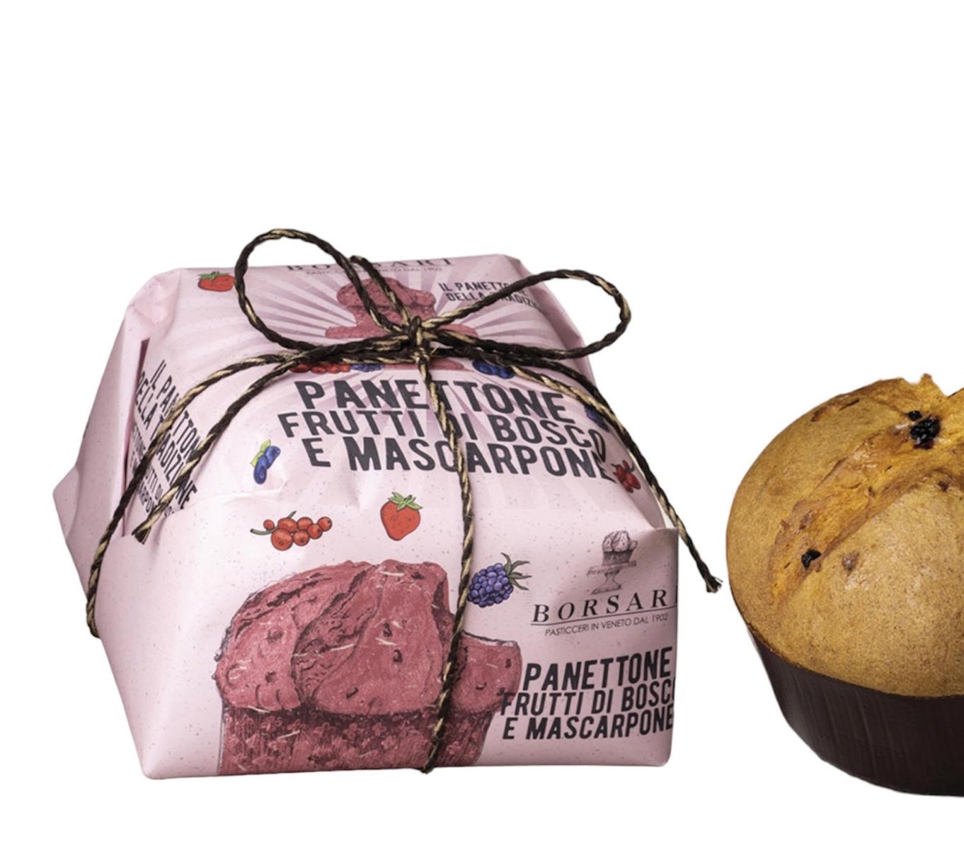 Gr.1000 Panettone ai frutti di bosco con crema al mascarpone - basso. In un'elegante confezione incartata a mano si cela un autentico capolavoro di bontà. Il Panettone Borsari con Frutti di Bosco e Crema al Mascarpone è morbido, soffice, dal gusto semplice di una volta ma con un tocco di novità che lo rende ancora più irresistibile.
