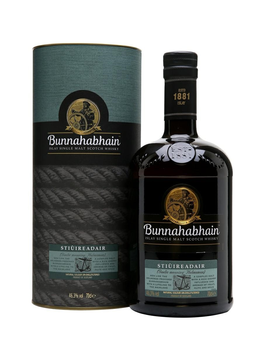 Formato bottiglia: cl.70 Gradazione alcolica: 46,3% vol. Prodotto in Scozia. Con astuccio in latta. Stiuireadair è la versione di whisky di botti ex sherry della Bunnahabhain distillery, che rimpiazza il 12 Year Old. Uno scotch tipicamente costiero, cremoso, con note di caramello, arachidi, frutta secca e tracce di spezie.