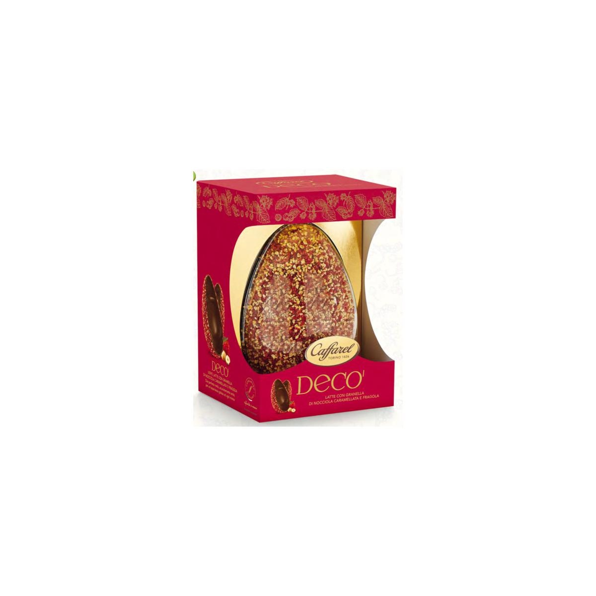 UOVO CAFFAREL DA 370g. Uovo di delicato cioccolato al latte avvolto e decorato da croccante granella di nocciola caramellata unita a gustose pepite di fragola. Cioccolato al latte (cacao: 32% minimo) ricoperto di cioccolato al latte ed alle nocciole Gianduja (cacao: 30% minimo) con granella di nocciole caramellate e preparato di fragola in pezzetti Ingredienti: zucchero, burro di cacao, nocciole caramellate 15% (nocciole 59%, zucchero, destrosio, miele), latte intero in polvere, pasta di cacao, reparato di fragola 6,5% (sciroppo di glucosio, fragola 35%, zucchero, amido di tapioca), nocciole 2,5%, latte scremato in polvere, emulsionante: lecitine (di soia), vanillina, mandorle. Può contenere altra frutta a guscio e semi di sesamo.