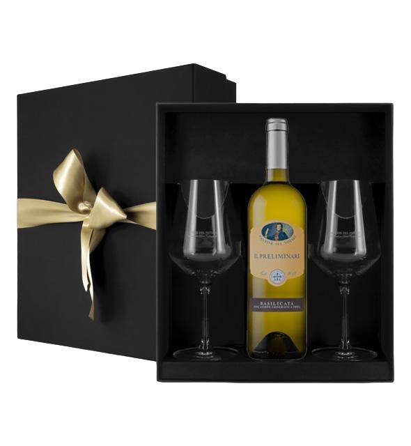 Elegante confezione con fiocco Cantine del Notaio. n.1 Confezione Fiocco; n.1 Bottiglia il Preliminare; n.2 calici.