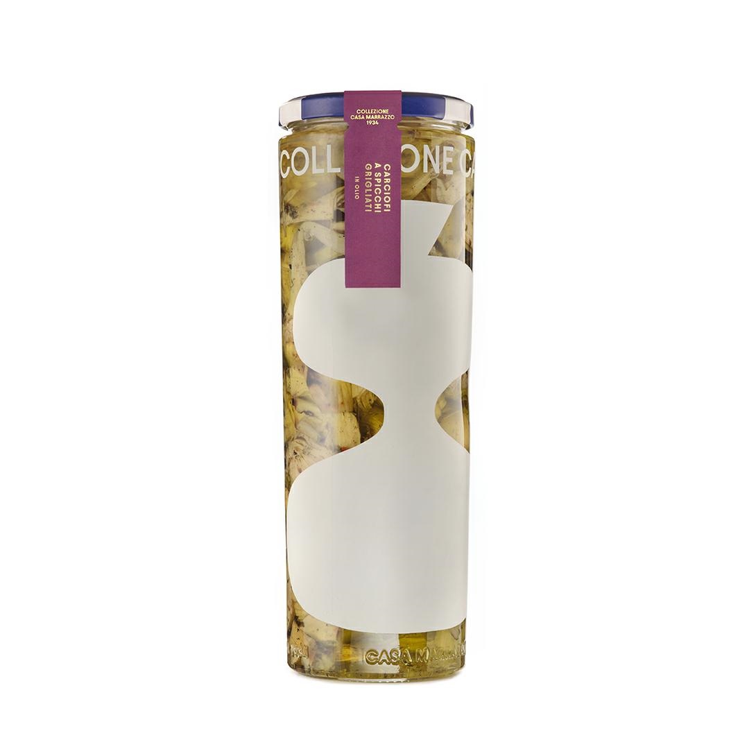 Croccanti carciofi tagliati in quattro pezzi, grigliati e conservati in olio. I carciofi grigliati sono un contorno sano e leggero. Dal sapore leggermente affumicato, grazie alla cottura. I carciofi di Casa Marrazzo, dal sapore delicato, sono ideali per antipasti sfiziosi e in abbinamento sia con la pasta sia con secondi piatti a base di carne. Caratteristiche: Formato 1000ml Ingredienti: Carciofi a spicchi , olio di semi di girasole , aceto , sale, aglio, prezzemolo, origano, pepe. Conservazione: Conservare in luogo fresco e asciutto, lontano da fonti di calore e dall’esposizione diretta ai raggi solari. Una volta aperto, conservare in frigo a +4°C e consumare entro 3 giorni.