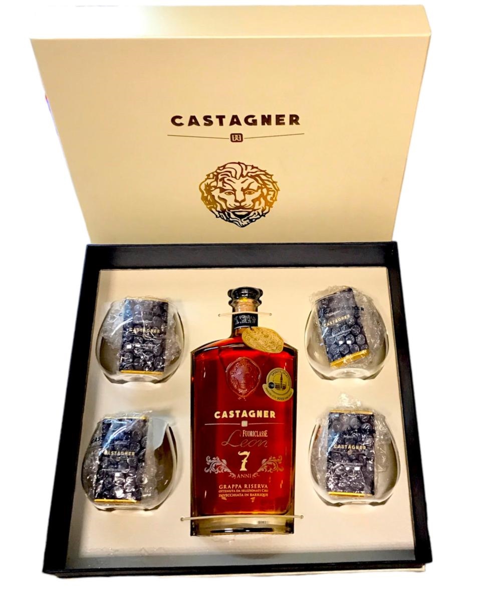 Confezione con una bottiglia cl.70 + 4 bicchieri degustazione + 4 cioccolatini. Fuoriclasse Leon riserva 7 anni. Gradazione alcolica: 38% vol. Invecchiata in Barrique.
