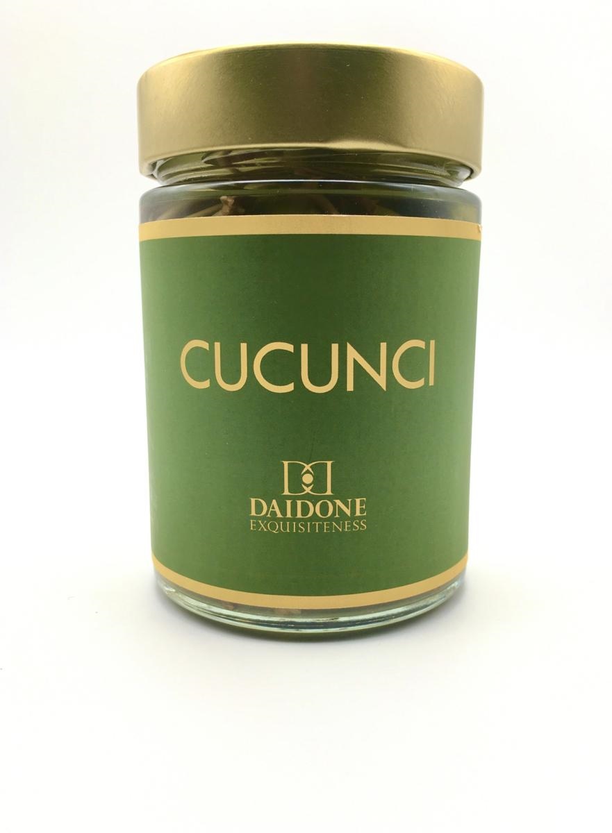 Gr.300 Quello che conosciamo con il nome di cappero è il bocciolo non ancora aperto. Se non viene colto il fiore sboccia e si avrà il frutto, cioè il cucuncio che di solito si raccoglie nel mese di agosto. Già guardandoli le differenze sono evidenti: i capperi sono più piccoli, mentre i cucunci hanno forma affusolata. Da un punto di vista organolettico, i capperi sono più profumati, mentre i cucunci più carnosi e sapidi; si sposano benissimo con antipasti e secondi piatti, vengono inoltre utilizzati anche insieme a salse,condimenti,con le insalate o anche compe aperitivo insieme al Martini.