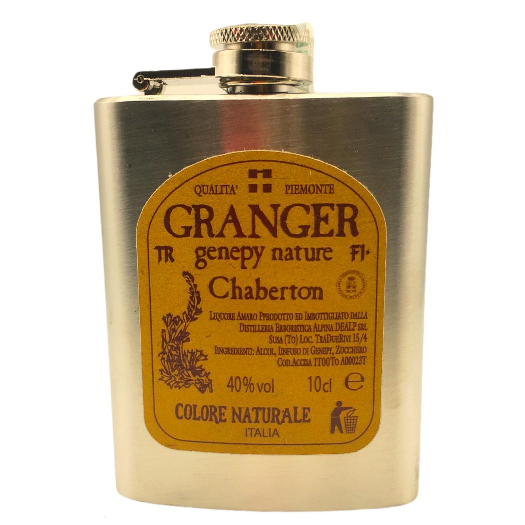 Formato fiaschetta: cl.10 Gradazione alcolica: 40% vol. Liquore Il Genepy è il liquore più tipico delle nostre montagne, servito nei rifugi e nelle baite delle nostre valli. La tradizione ha sempre attribuito al Genepy uno straordinario pregio, e anche la letteratura arricchisce la vita dell’aromatico liquore. Il famoso botanico torinese Carlo Allioni nel suo Rariorum Pedemontii Stirpium del 1755 ne decantava le virtù e anche lo scrittore francese Rousseau nelle sue Confessioni parlava di un giardiniere morto a causa delle ricerche di Genepy in montagna. Negli anni 70 la nostra distilleria ha iniziato la produzione del Granger Genepy Nature. Il metodo di preparazione è sempre quello di una volta: le piantine si pongono all’interno di una soluzione idroalcolica in contenitori di acciaio inox e qui sono lasciate in infusione per 40-50 giorni. L’infuso ottenuto viene torchiato e aggiunto ad una miscela di acqua e zucchero, per ottenere il giusto equilibrio tra erba, alcool e zucchero