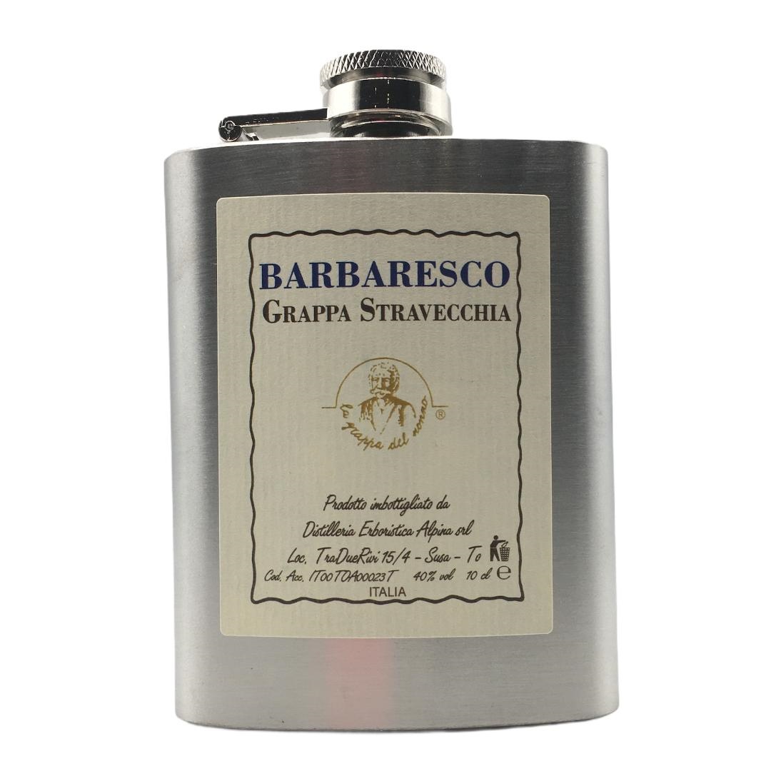 Formato fiaschetta: cl.10 Gradazione alcolica: 40% vol. Grappa invecchiata ottenuta dalla distillazione di vinacce di uve Nebbiolo da Barbaresco, vitigno per eccellenza del Piemonte, che trova il suo terreno ideale nelle colline intorno ad Alba, Barbaresco. Colore ambrato dato dall'affinamento in legno, profumo intenso con sentori di vaniglia e aroma tannico del legno maturo.