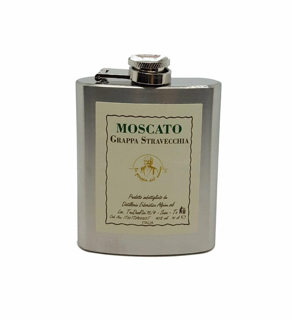 Formato fiaschetta: cl.10 Gradazione alcolica: 40% vol. La grappa di moscato è ottenuta da vinacce del tipico e famoso Moscato d’Asti delle zone DOC storiche. Per la sua produzione il grappolo d’uva viene diraspato e la vinaccia fresca avviata in distilleria per procedere alla fermentazione accelerata per cogliere il massimo dei profumi e degli aromi. Segue un leggero affinamento in piccole botti di rovere. Il colore è quello giallo paglierino tenue che deriva dall’affinamento in botte piccola. Il profumo è ampio e coinvolgente. Intenso persistente e tipico dell’uva moscato appena raccolta. Il sapore al palato è morbido, profondo, con inconfondibile ricchezza di aromi fruttati. Il retrogusto è delicatamente dolce e lungamente persistente.