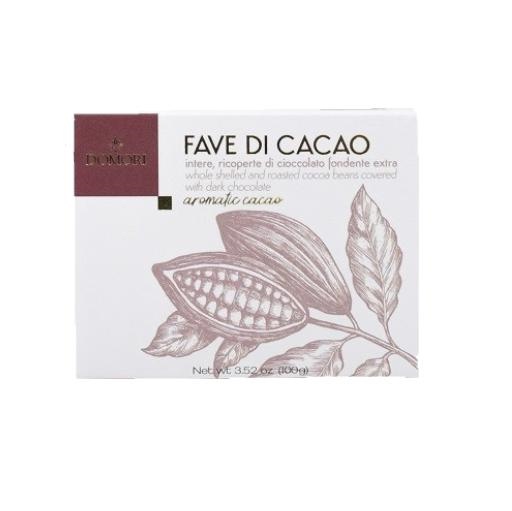 Fave di cacao immerse nel cioccolato fondente per una ricchezza di cacao aromatico, raccolto da Domori nelle piantagioni in Sud America e Africa.