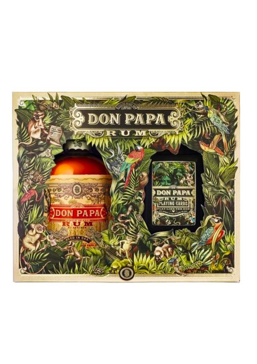Confezione con una bottiglia cl.70 e carte da gioco. Gradazione alcolica: 40% vol. Don Papa è l'originale Single Island Rum che arriva dalle Filippine. Ispirato da Papa Isio, eroe della Rivoluzione e sciamano dell'isola di Negros da cui questo Rum proviene. Maturato ai piedi del Monte Kanlaon, Don Papa 7 anni è invecchiato in botti ex-Bourbon ed ex-Rioja di rovere americano per un profilo più secco e più complesso, prima di essere blendato fino a raggiungere la perfezione dal nostro Master Blender. Al naso note fragranti di scorza di limone, mango e nocciole. Al palato il blend delizia con importanti sentori fruttati di vaniglia e toffee. Il finale è affidato al rovere tostato che restituisce sensazioni rotonde, lunghe e secche. Come si dice a Negros, è un Rum così perfetto che si può bere così come esce dalla bottiglia.