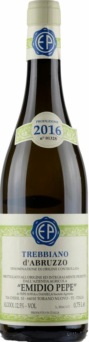 Formato bottiglia: cl.75 Gradazione alcolica: 12,5% vol. Prodotto a teramo, Abruzzo (Italia). Il Trebbiano d'Abruzzo di Emidio Pepe prende vita nei vigneti a conduzione biologica e biodinamica che si trovano nel comune di Torano Nuovo, in provincia di Teramo. È un vino interamente a base di uve Trebbiano, vendemmiate manualmente con selezione dei grappoli in vigna. Il mosto fermenta in maniera spontanea all'interno di vasche di cemento vetrificate. In seguito è imbottigliato a mano e lasciato affinare per qualche mese prima di essere immesso in commercio. Il Trebbiano d'Abruzzo di Emidio Pepe appare di colore giallo dorato luminoso. All'olfatto emergono fragranti note di menta e di miele, corredate da sentori di cuoio e di spezie. In bocca è ben delineato ed equilibrato, ammantato di vibrante freschezza. Si può accostare bene ad antipasti alle verdure e alle minestre, inoltre non disdegna le pietanze a base di pesce e di carni bianche.