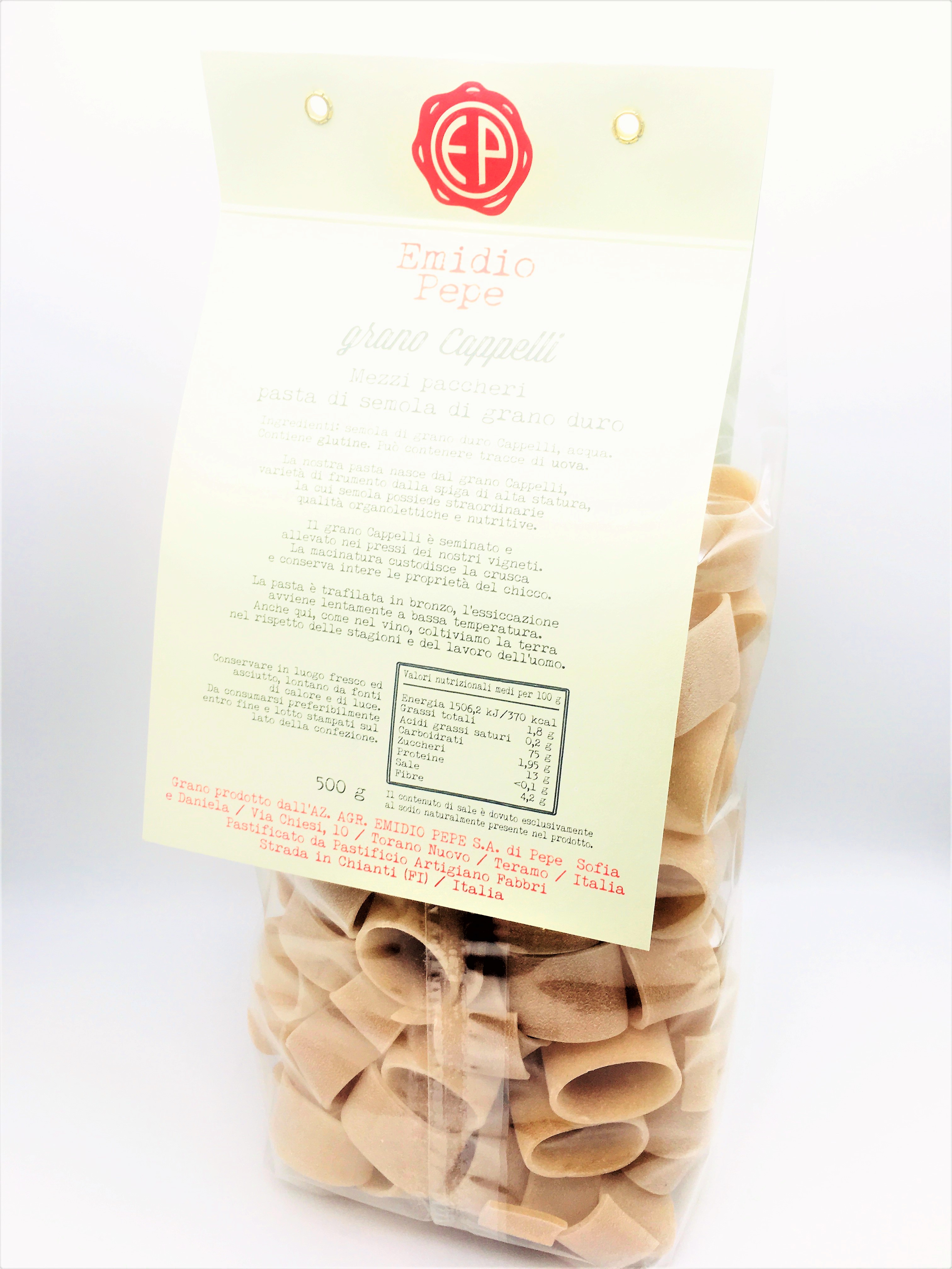Gr.500 La nostra pasta nasce dal grano Cappelli, varietà di frumento dalla spiga di alta statura, la cui semola possiede straordinarie qualità organolettiche e nutritive. Il grano Cappelli è seminato e allevato nei pressi dei nostri vigneti. La macinatura custodisce la crusca e conserva intere le proprietà del chicco. La pasta è trafilata in bronzo, l'essiccazione avviene lentamente a bassa temperatura. Anche qui, come nel vino, coltiviamo la terra nel rispetto delle stagioni e del lavoro dell'uomo. Ingredienti: Semola di grano duro Cappelli, acqua. Contiene glutine. Può contenere tracce di uova.
