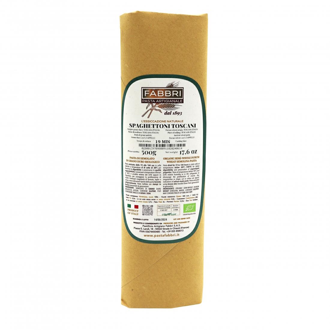 Pasta di semolato biologico, 100% grano antico Cappelli (Origine: Toscana) prodotta seguendo il metodo Fabbri: cioè una pastificazione ed essiccazione rigorosamente al di sotto dei 38° centigradi in modo da mantenere inalterate le proprietà organolettiche della semola. Per ottenere i nostri spaghettoni toscani, ci vogliono 144 ore d’essiccazione in celle statiche, prima di essere segati e confezionati. INGREDENTI: Semolato di grano duro biologico, acqua. Contiene glutine. Può contenere tracce di uova, soia e senape. VALORI NUTRIZIONALI MEDI PER 100 g energia 1423 kJ / 340 kcal grassi 2,5 g di cui acidi grassi saturi 0,8 g carboidrati 68 g di cui: zuccheri 3,7 g fibre 3 g proteine 12,5 g sale 0,02 mg poichè la pasta è artigianale è consigliato conservarla a temperature inferiori ai 18°C e con umidità relativa del 65% oppure in frigorifero, per scoraggiare la proliferazione di insetti. Il tempo di cottura può variare leggermente in funzione della quantità e qualità delle proteine del grano pastificato. La crescita del grano è infatti influenzata dalle condizioni atmosferiche e dalla tipologia di terreno. Per questo, la semola ottenuta è sempre diversa e può incidere sulla pastificazione e quindi sulle caratteristiche della pasta: cottura, tenacità del glutine, quantità di amido rilasciato in pentola ecc. Le irregolarità di formato, taglio e colore sono caratteristiche tipiche della pasta tradizionale artigiana.