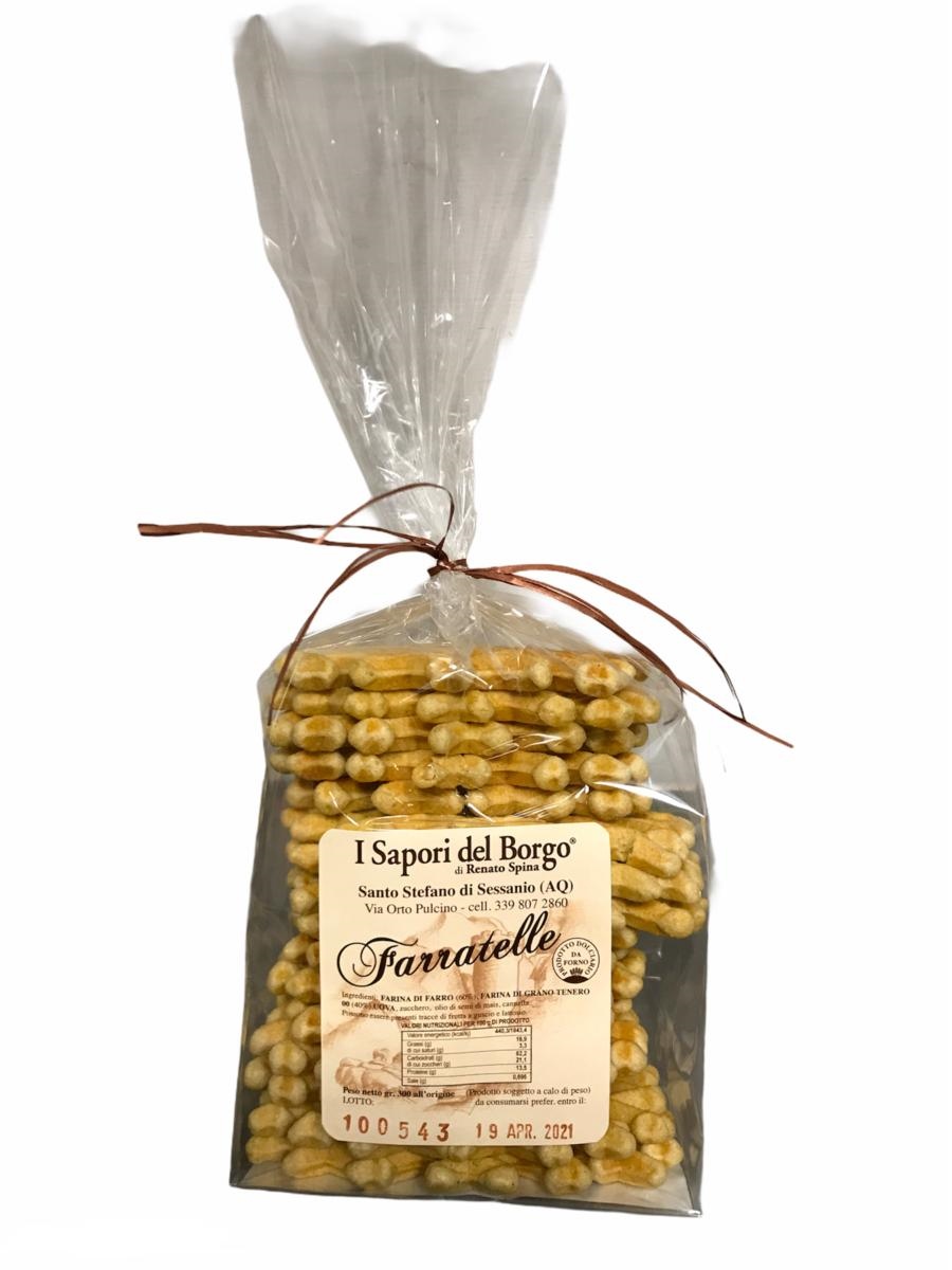 Gr.300 Sottili e croccanti cialde romboidali con un leggero retrogusto di cannella e arricchite dalla farina di farro. La particolarità di questo prodotto consiste nella sua preparazione; infatti le farratelle (il nome originale è ”ferratelle”) vengono cotte fra due piastre di ferro molto calde che pressano le palline di pasta e imprimono loro un disegno. Le farratelle sono gustosissime anche le confetture, con la cioccolata e con miele misto a frutta secca. Ingredienti: farina di farro, farina “00”, uova, zucchero, olio di semi di mais, cannella Conservanti: Nessuno Allergeni: farina di farro,farina”00”,uova Conservazione: conservare in luogo fresco e asciutto al riparo da fonti di calore; una volta aperta la confezione richiuderla accuratamente per garantire il sapore e la fragranza originari.