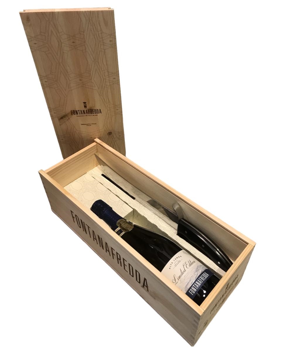 Confezione in legno con una bottiglia cl.75 e una sciabola. Uve: Pinot nero, Chardonnay Zona di produzione: Colline della Langa Tipo di terreno: Terreno costituito da argille bianche intervallate da strati di sabbie calcaree Esposizione e altitudine: Sud, sud-est - 250/500m slm Sistema e impianto: Guyot 5.000 ceppi/ha Vendemmia: Fine agosto, inizio settembre Gradazione: 12,5% vol Temperatura di servizio: 6-8°C