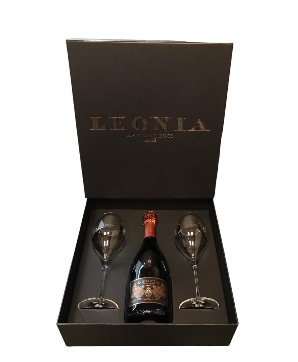 Confezione con due calici degustazione e spumante rosè metodo classico Leonia. Il colore richiama alla memoria la buccia di cipolla, e al calice è impreziosito da un perlage finissimo e vivace. Sentori fruttati di fragoline di bosco e di albicocca aprono l’olfattiva, che poi si sviluppa su note di lieviti e brioche, e su accenni tostati. Il sorso è fresco e persistente, fragrante, equilibrato e morbido, di ottima armonia nel complesso. Alcol 12,5% Bottiglia 750 ml.