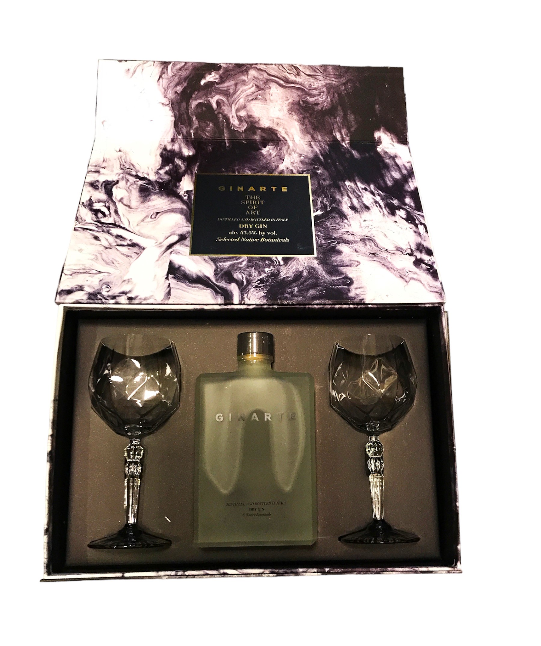 Confezione regalo contenente una bottiglia di Ginarte Dry Gin e due calici cocktail in cristallo ecologico, con boule raffinatamente sfaccettata e base personalizzata con scritta Ginarte.