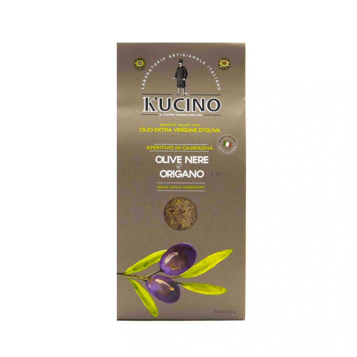 Gr.150 Biscotto Olive & Origano. Questi biscotti propongono un inedito connubio tra olive e origano. Perfetti come accompagnamento di antipasti o minestre asciutte, si gustano abbinati con Salice Salentino Rosso delle terre pugliesi con cui hanno in comune l'origine. Cosa siamo: biscottini di farina frumento, olio extravergine di olive, olive nere 8%, agente lievitante bio, origano 1%, sale.