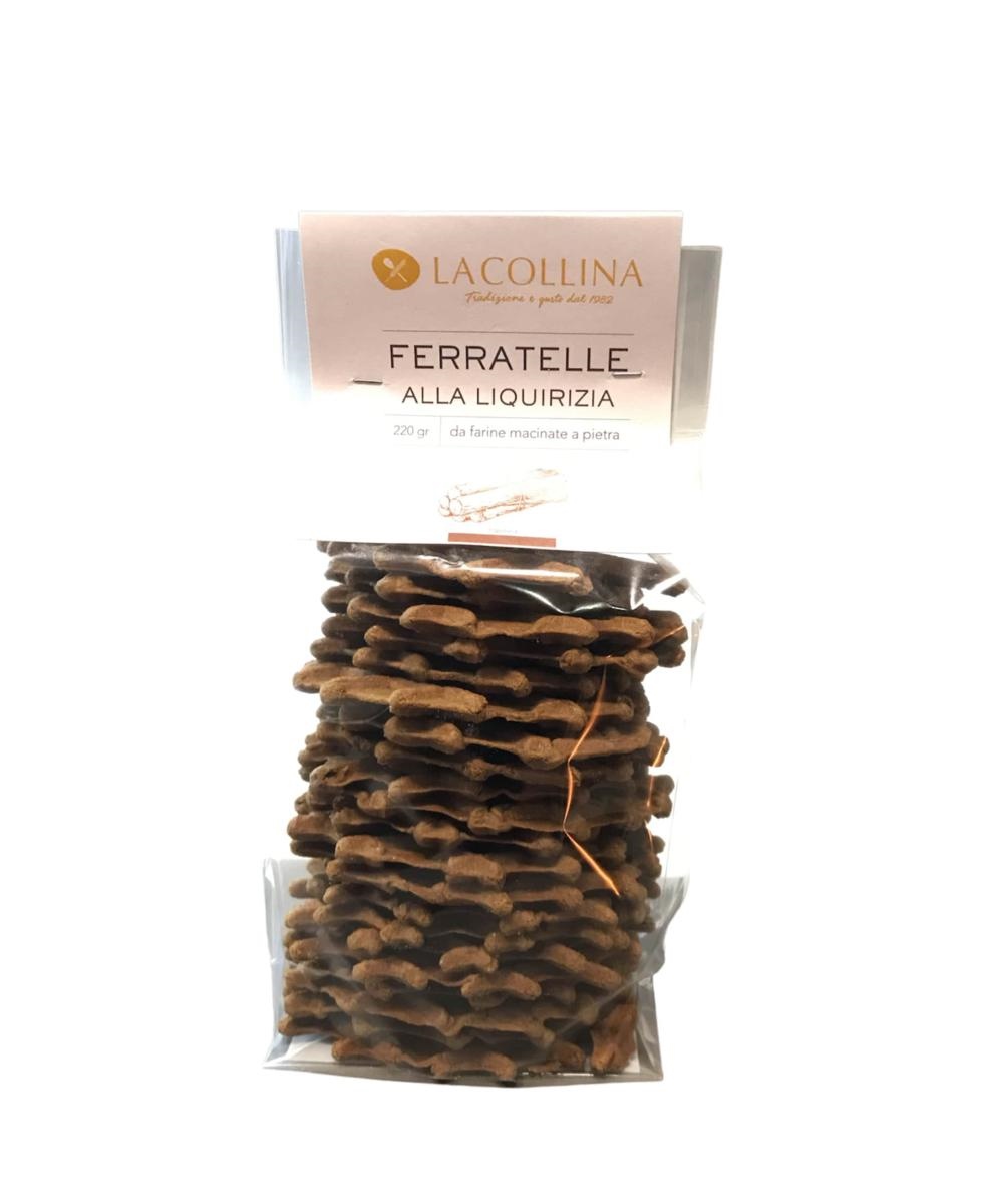 Le Ferratelle Artigianali alla Liquirizia, nella loro confezione da 220 grammi, sono una variante delle deliziose cialde di pasta biscotto tipiche della tradizione natalizia abruzzese. Disegnate con tante scanalature, sempre pronte ad accogliere creme di nocciola e cioccolato amaro, frutta secca, miele o confetture, queste croccanti prelibatezze sono diventate un cult delle tavole della regione anche in qualsiasi altra occasione dell’anno, tanto invernale quanto estiva. Apprezzate per accompagnare gelati, come anche formaggi e secondi salati, le Ferratelle alla Liquirizia aggiungono agli ingredienti base classici (ossia uova, olio di mais, zucchero e farina di grano 0) anche una nota di decisa liquirizia. Dal sapore dolciastro e al contempo balsamico, queste eleganti cialde, impreziosite della presenza della terapeutica pianta erbacea mediterranea, sono super apprezzate a chiusura di un pasto come per una prima colazione gourmet dal retrogusto alternativo.