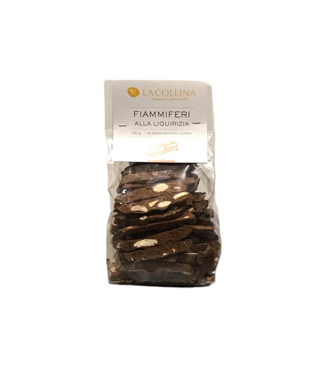 Croccanti, delicati, aromatici, questi sono i Fiammiferi alla Liquirizia artigianali nella confezione da 220 grammi, una delle ultime creazioni più sfiziose e originali che vengono preparate con farina di grano “0”, uova, olio di mais, zucchero, mandorle, liquirizia. I fiammiferi li puoi accendere con una tazza del tuo tè preferito, di un caffè nero bollente o della tua bevanda vegetale. Non importa come li accompagni, saranno sempre i protagonisti del tuo viaggio nei sapori a colazione o a merenda. I Fiammiferi alla Liquirizia Artigianali sono una variante sfiziosa dei più classici fiammiferi alle mandorle. Nella loro confezione da 220 grammi, accendono i palati delle persone in cerca di gusti particolari, interessate all’aspetto gourmet del cibo. Questi biscotti sono il frutto di un mix d’ingredienti tra i quali uova fresche, farina di grano 0, olio di mais, zucchero, mandorle e, infine lei, la liquirizia. Dal sapore aromatico particolare e dal retrogusto dolciastro, questa pianta erbacea impreziosisce i biscotti artigianali conferendo loro una nota balsamica che ricorda i sentori organolettici dell’avvolgente anice.