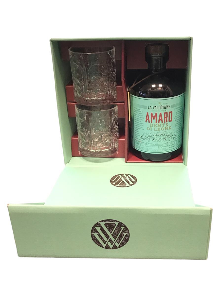 Confezione con una bottiglia cl.70 e due bicchieri. Al Tarassaco, o Dente di Leone, si attribuiscono poteri magici. Nato dalla polvere sollevata dal carro del Dio Sole, nutre Teseo per trenta giorni prima della vittoriosa lotta con il Minotauro. Innamorati di tutto il mondo si affidano a questo fiore per conoscere il futuro dello loro passioni. Gli erboristi di tutti i tempi hanno sempre preferito il fiore di origine montana in quanto più piccolo e più ricco in principi attivi. In questa ricetta il Dente di Leone è affiancato a numerose erbe alpine e all’amaricante muscovado che lo rendono ancor più intrigante al palato.