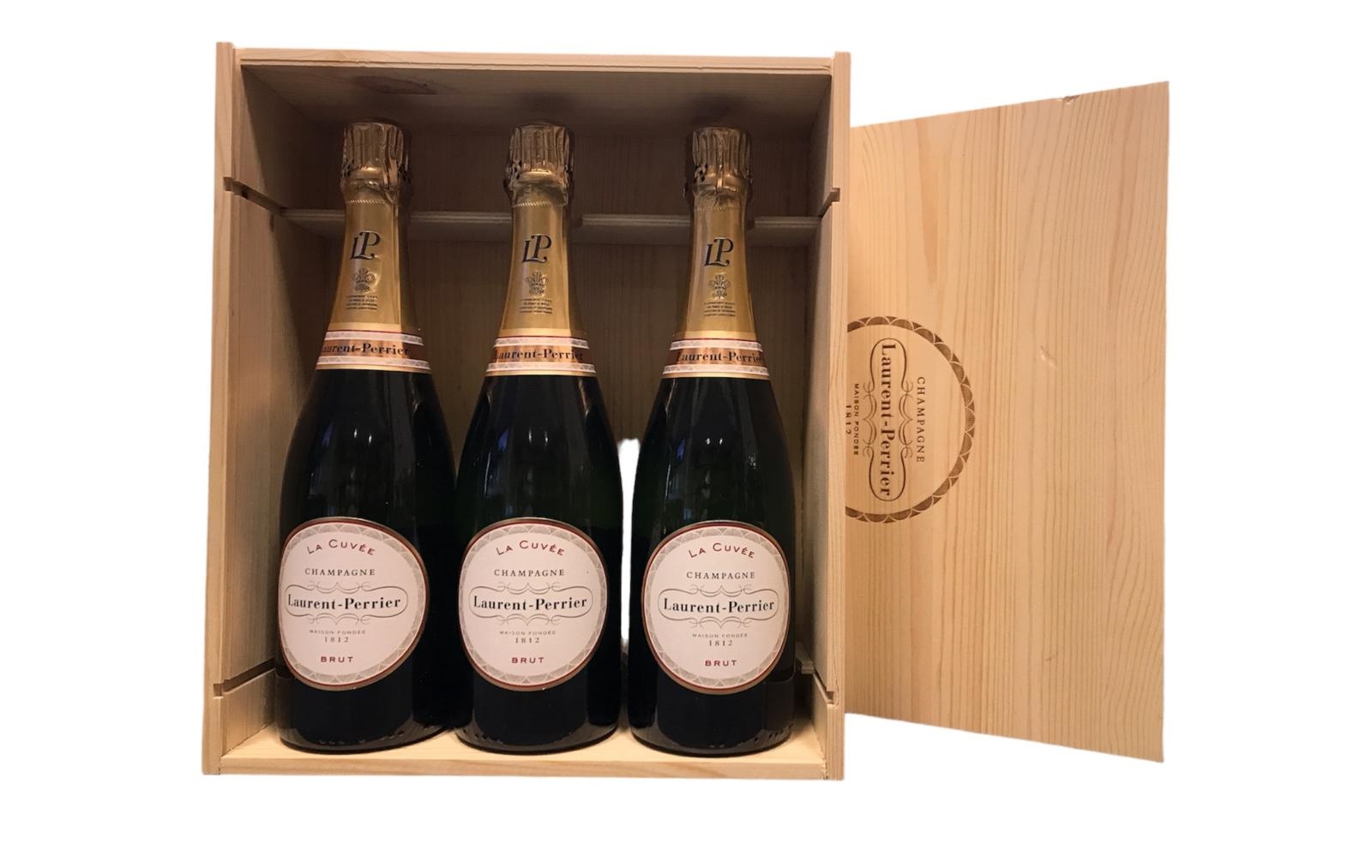 Casetta in legno con 3 bottiglie. Varietà di uve: Chardonnay +50%, Pinot Nero 30-35%, Meunier 10-15% Prenota vini: 15-30% CRU: +100 Cru Invecchiamento: 4 anni. Ottenuto dal succo d'uva più puro, “La Cuvée” introduce lo stile Laurent-Perrier. Composto principalmente da Chardonnay, questo champagne è caratterizzato da grande finezza e bella freschezza ottenute dopo un lungo invecchiamento nelle nostre cantine.