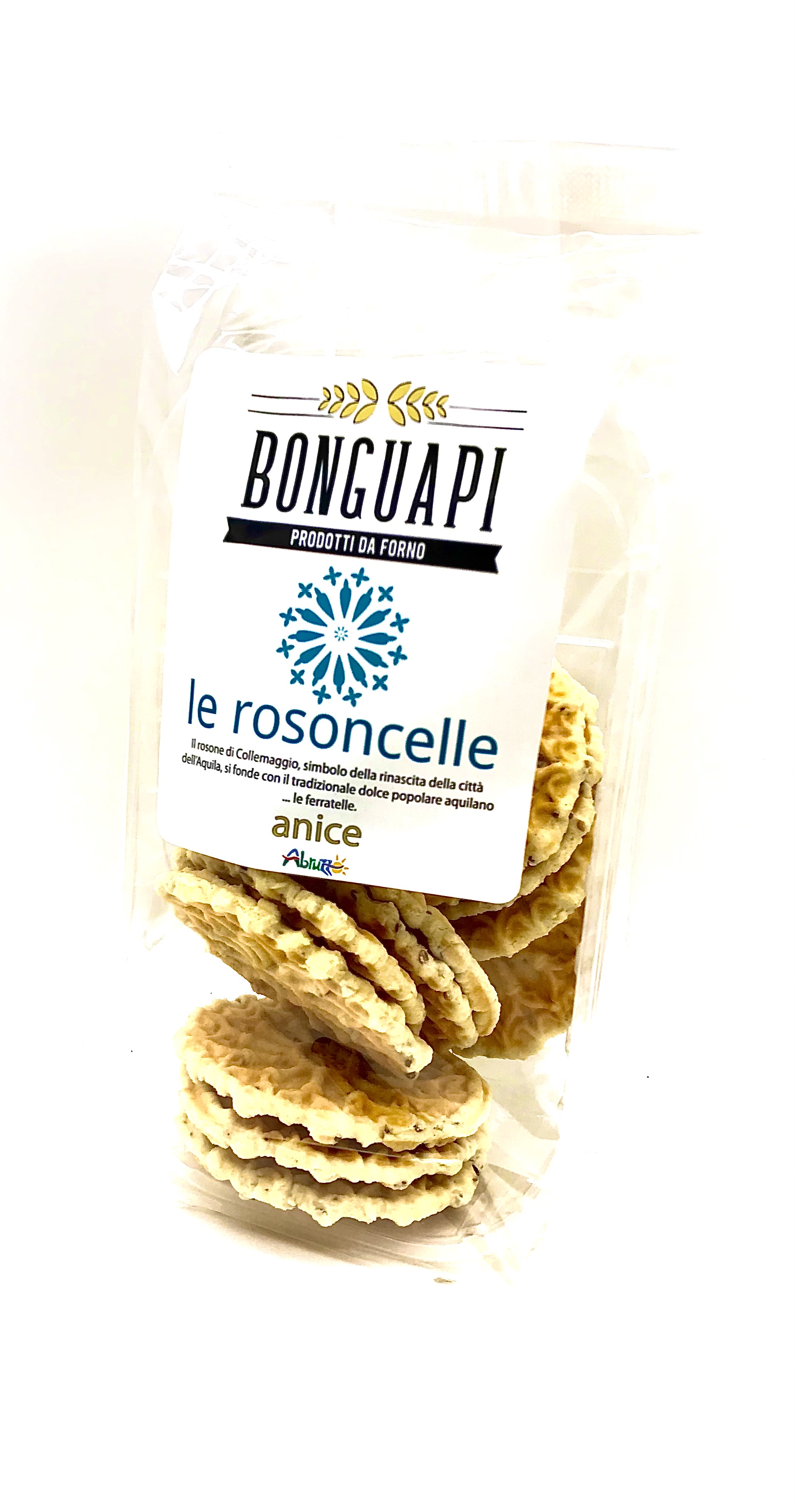 200gr. Ingredienti: farina di Frumento "00", zucchero, BURRO, LATTE, albume d'UOVO, tuorlo D'UOVO, aroma naturale scorza di limone. Il rosone di Collemaggio, simbolo della rinascita della città dell'Aquila, si fonde con il tradizionale dolce popolare aquilano..la ferratella.