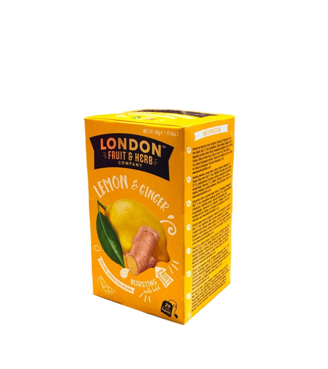 Produttore: London. Formato: 20 bustine. Nazionalità: Inghilterra. Tipologia: In filtri. 1 confezione da 20 bustine d'infuso al gusto di limone e zenzero. Prodotto senza caffeina. Ingredienti: Polpa di mela, zenzero 25%, correttore di acidita', aromi, radice di cicoria torrefatta, foglie di mora, scorze di limone, tiglio argentato, citronella. Peso netto: 40g.