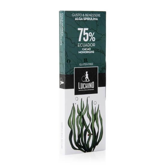 75% Cacao Monorigine Ecuador – Spirulina Italiana Ricca di sali minerali, vitamine e proteinw. L’alga spirulina è stata riconosciuta come alimento superfood. Luchino ha unito le proprietà benefiche della spirulina con le note fruttate del miglior cacao Ecuadoreno creando un cioccolato nutriente e gustoso, ricco di proteine e dal gusto intenso. Peso netto: 60 Gr. Ingredienti: Massa di cacao monorigine Ecuador (min 75%), Zucchero di canna, Spirulina in polvere 3%
