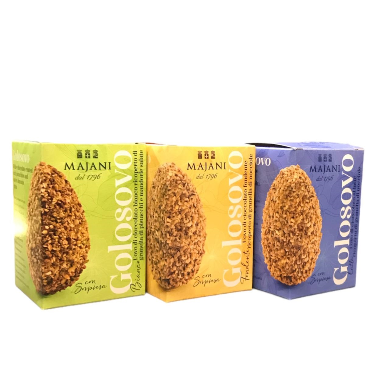 Uova da 100 gr disponibili nei gusti al latte con nocciole, cioccolato bianco con granella di pistacchio e fondente con nocciole!