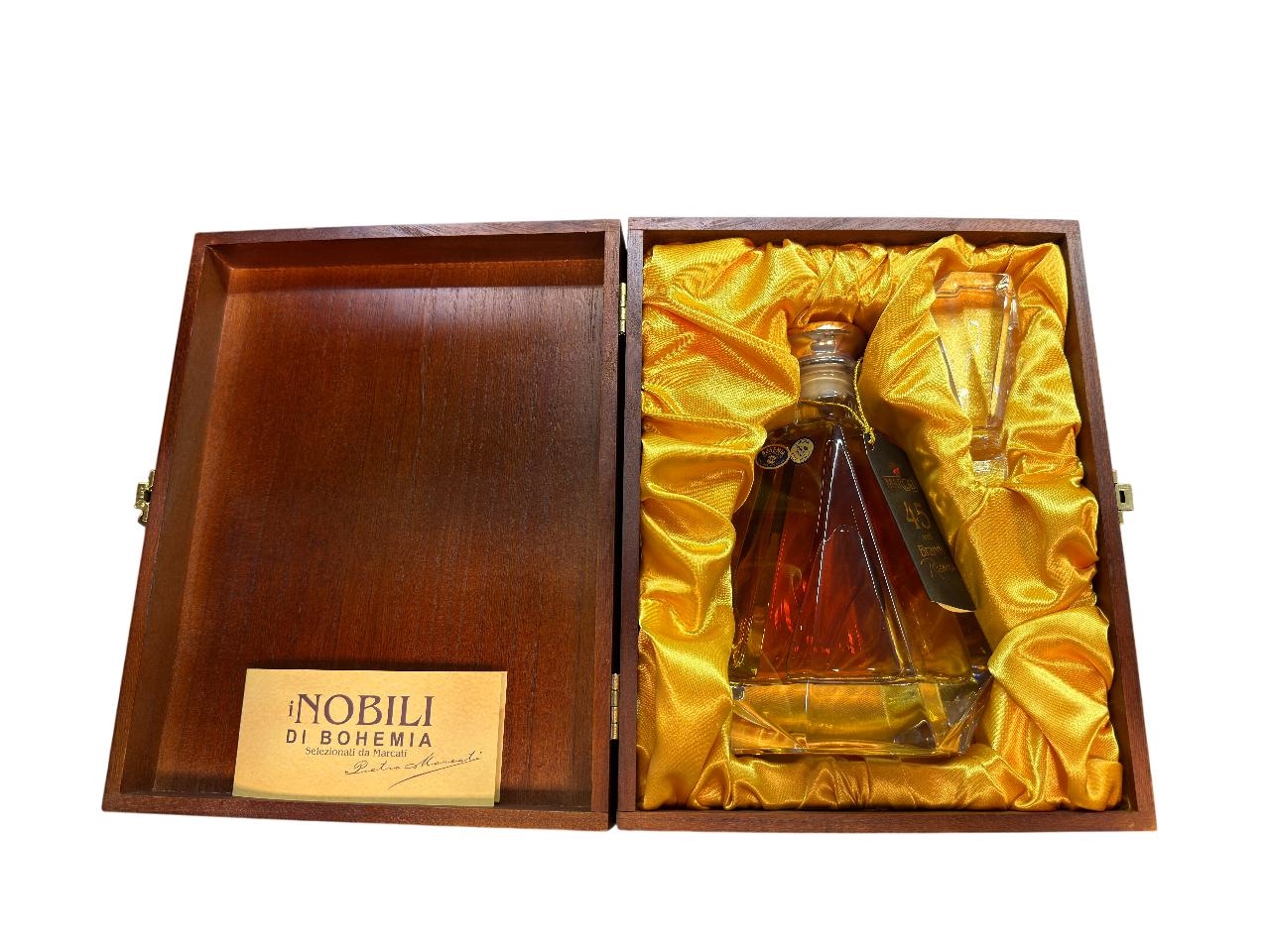 Marcati ha selezionato una linea di distillati unici, lungamente invecchiati in botti di rovere e gelosamente custoditi nelle proprie cantine. Le bottiglie in cristallo di Boemia, con la loro inconfondibile purezza, esaltano il pregio di un prodotto unico. Riserva di 45 anni. La famiglia Marcati presenta con orgoglio questo brandy italiano lungamente invecchiato in botti di rovere; aromatico ed armonico è un distillato prestigioso destinato a momentidi autentico piacere.