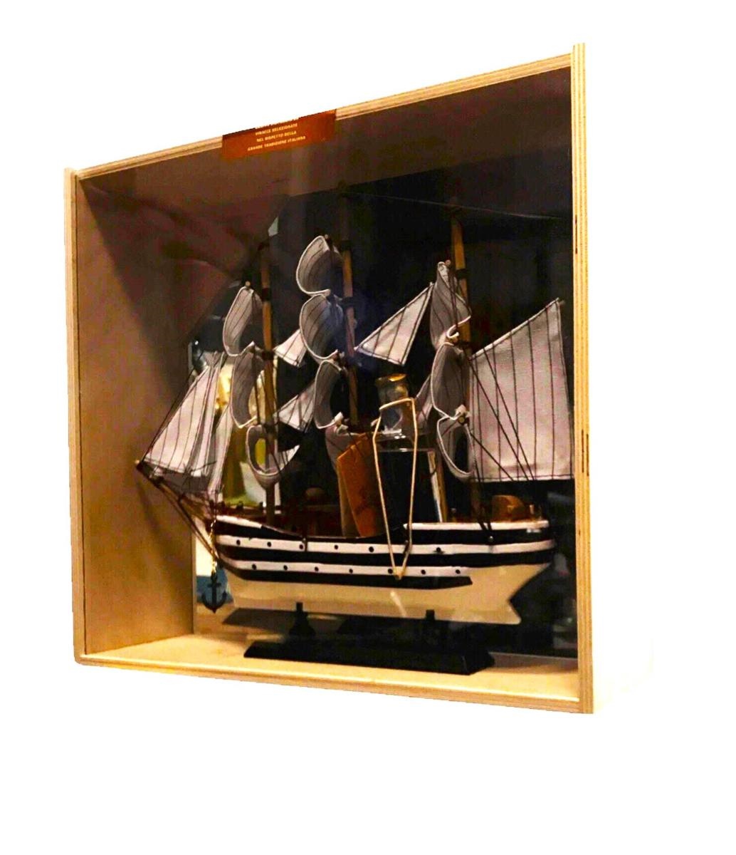 Grappa Marcati in un versatore in vetro soffiato contenente un elegante e scenografico veliero, la base è in legno.